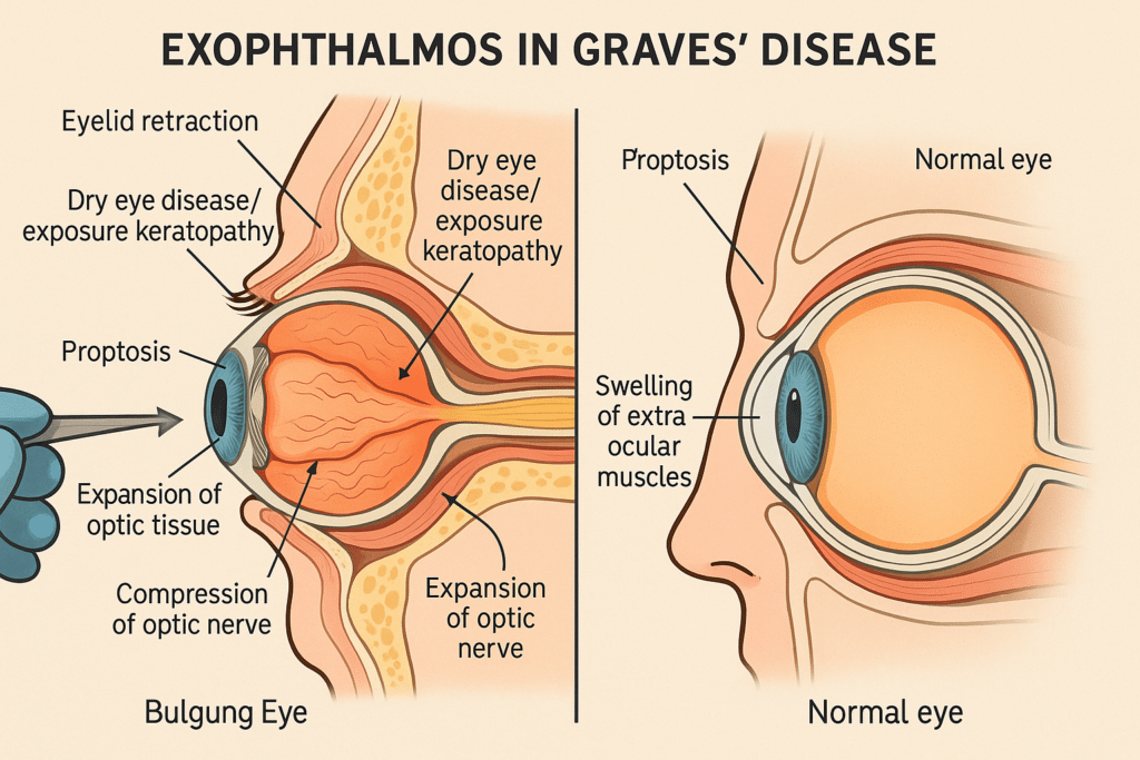 Possible links to thyroid eye disease or strabismus, causing bulging or misalignment.